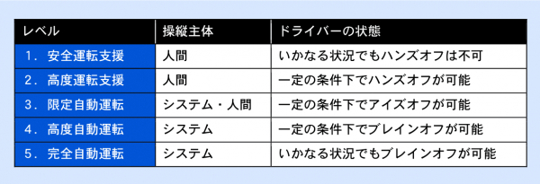 自動運転に関してはシステムが操舵・加減速のどちらかをサポートする「レベル1」、操舵・加減速のどちらもサポートする「レベル2」、特定の場所ですべてを操作、緊急時はドライバーが操作する「レベル3」、特定の場所ですべてを操作する「レベル4」、場所の限定なしにすべてを操作する「レベル5」があります。