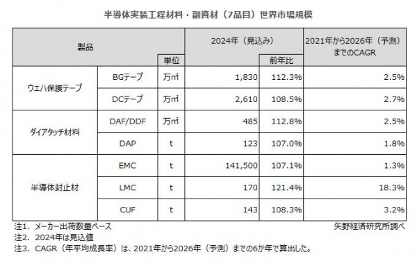 2024年の半導体実装工程材料・副資材世界市場規模(メーカー出荷数量ベース)は、BGテープは1,830万平方メートル(前年比:112.3%)、DCテープは2,610万平方メートル(同108.5%)、DAF/DDFは485万平方メートル(同112.8%)、DAPは123t(同107.0%)、EMCは141,500t(同107.1%)、LMCは170t(同121.4%)、CUFは143t(同108.3%)となる見込みである。