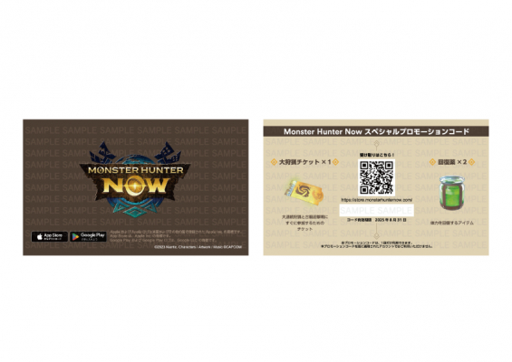 本キャンペーンでは、2025年1月18日(土)以降に『モンスターハンター・ザ・フィールド inニジゲンノモリ』のアトラクションで対象のチケットを購入された方、先着1万名様に『モンスターハンターNow』ゲーム内で使用できるアイテムが手に入るプロモーションコードと、キャンペーン限定のオリジナルステッカーをお渡しいたします。