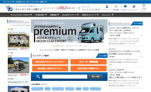 当サイトは、これからキャンピングカーの購入を検討されている方へ向けた日本最大級のキャンピングカーの比較サイトです。国内・海外を含む850台以上のキャンピングカーを、価格や車両サイズ、就寝人数やオプション装備など、約60種類の項目からスペック比較ができ、どのキャンピングカーが人気かを一定期間の閲覧数を基にランキング形式で表示。