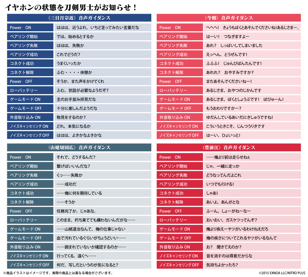 本コラボレーションモデルは、「三日月宗近」「今剣」「山姥切国広」「豊前江」の4モデルをラインナップ。左右ハウジングには各刀剣男士紋をデザイン、充電ケースには“円”を“縁”として、刀剣男士との縁をテーマに、各刀剣男士の「紐」のデザインを軸に衣装や特徴、柄などのモチーフを取り入れ、紐で縁(円)を結ぶ、「縁結び」をコンセプトとしたデザインとなります。なお、各刀剣男士の音声ガイダンスはすべて録り下ろしボイスとなります。