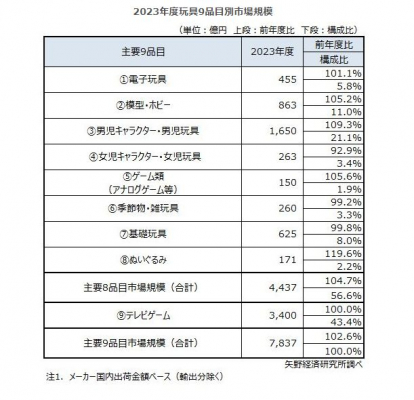 2023年度の玩具市場規模(メーカー国内出荷金額ベース)は、主要8品目で4,437億円(前年度比4.7%増)、テレビゲームを含んだ主要9品目では7,837億円(同2.6%増)と推計した。