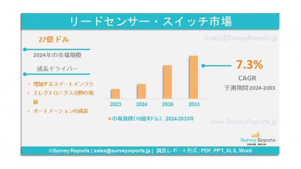 Surveyreportsの専門家は、リードセンサースイッチ市場の調査を分析し、2024年にリードセンサースイッチ市場規模が27億米ドルに達すると予測した。さらに、リードセンサースイッチ市場のシェアは、2033年末までに47億米ドルに達すると予測されている。リードセンサースイッチ市場は、2024年から2033年の予測期間にわたって、年間平均成長率(CAGR)約7.3%で成長すると予測されている。