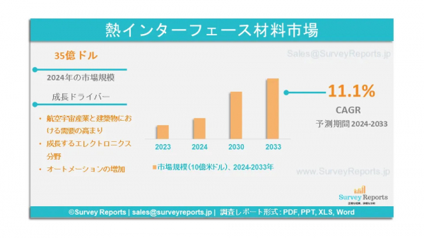 Surveyreportsの専門家は、サーマルインターフェース材料市場の調査を分析し、2024年に生成されたサーマルインターフェース材料市場規模は35億米ドルに達すると予測した。さらに、サーマルインターフェース材料市場のシェアは、2033年末までに98億米ドルに達すると予測されている。サーマルインターフェース材料市場は、2024年から2033年の予測期間にわたって、年平均成長率(CAGR)約11.1%で成長すると予測されている。