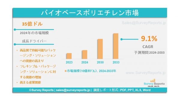 Survey Reports LLCは、2025年1月にバイオベースポリエチレン市場のセグメンテーションに関する調査レポートを発行したと発表した。タイプ別(バイオベースHDPE、バイオベースLLDPE、バイオベースLDPE)、材料別(硬質、軟質)、 用途別(農業、食品および飲料、化粧品および家庭用品、パーソナルケア、繊維、医薬品、その他) - グローバル市場分析、動向、機会、予測、2024年から2033年」は、バイオベースポリエチレン市場の予測評価を提供する。バイオベースポリエチレン市場の成長促進要因、市場機会、課題、脅威など、いくつかの重要な市場力学に焦点を当てている。
