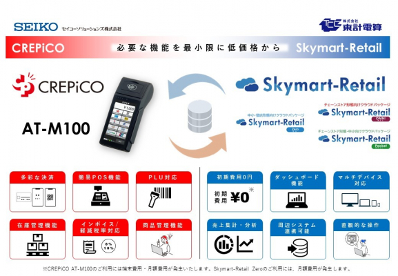 セイコーソリューションズ株式会社(代表取締役社長:関根 淳、本社:千葉県千葉市、以下 セイコーソリューションズ)は、最新モバイル決済端末「CREPiCO AT-M100」の簡易POS機能を、株式会社東計電算(代表取締役社長:古閑 祐二、本社:神奈川県川崎市、以下 東計電算)の販売管理システム「Skymart-Retailシリーズ」とシステム連携し、会計業務から販売管理までのトータルでの自動化、コスト削減を実現する新たなトータルソリューションとして、1月22日(水)~24日(金)にパシフィコ横浜にて行われる「SCビジネスフェア2025」にて先行出展いたします。なお、本システムの連携は、2025年8月頃を予定しています。