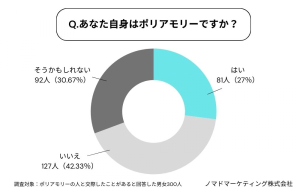 「はい」「そうかもしれない」と回答したのは男女300人中173人。半数以上の人がポリアモリーもしくはポリアモリーかもしれないと回答しました。