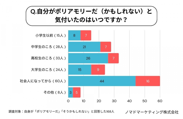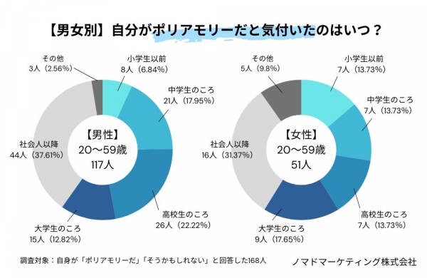 また、自身がポリアモリーだ(かもしれない)と気付いたタイミングについて、男女別で回答をまとめました。