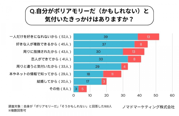 ポリアモリー(かもしれない)と気付いたきっかけについては、男女ともに「一人だけを好きになれないから」が最多回答に。「周りに指摘された」「周りと違うと気付いた」など、周りの人との恋愛と比較して気付く人も多いようです。