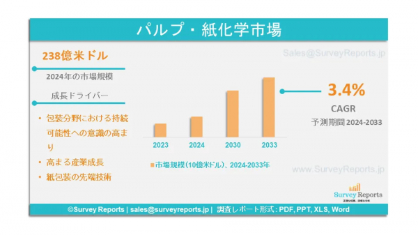 Survey Reports LLCは、2025年1月に出版した調査レポート「パルプ・製紙用化学品市場のセグメンテーション:種類別(バインダー、漂白剤、充填剤、パルプ化、サイジング、その他)、用途別(新聞 、包装、産業用紙、印刷および筆記用紙、パルプ工場、飲料工場、その他の用途) - グローバル市場分析、動向、機会および予測、2024年から2033年」というパルプ・製紙用化学品市場の予測評価を提供する調査レポートを発行した。このレポートでは、パルプ・製紙用化学品市場の成長促進要因、市場機会、課題、脅威など、いくつかの重要な市場力学に焦点を当てている。