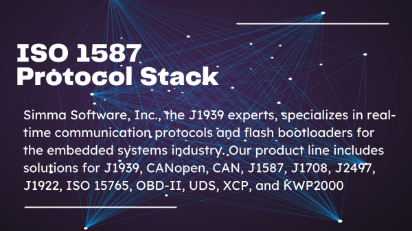 シンマソフトウェア(Simma Software, Inc.)は、アメリカ合衆国インディアナ州西端、ビーゴ郡に位置する都市テレホートに本社を置いています。自動車業界向けのJ1708、UDSプロトコルスタック、J1939インタフェースオプションなど、セーフティクリティカルなリアルタイム組込みソフトウェア開発を専門としています。製品ラインには、J1939、CANopen、CAN、J1587、J1708、J2497、J1922、ISO 15765、OBD-II、UDS、およびKWP2000用のソリューションが含まれています。ソフトウェアは、100万台以上の電子制御ユニット、110の設計、100以上のお客様に使用されています。当社の製品は、フォード、ボーイング、米軍、すべての主要OEM(フレイトライナー、インターナショナルなど)のいくつかのティアワンサプライヤー、いくつかのセルラー機器プロバイダー、および診断機器メーカーによって使用されています。