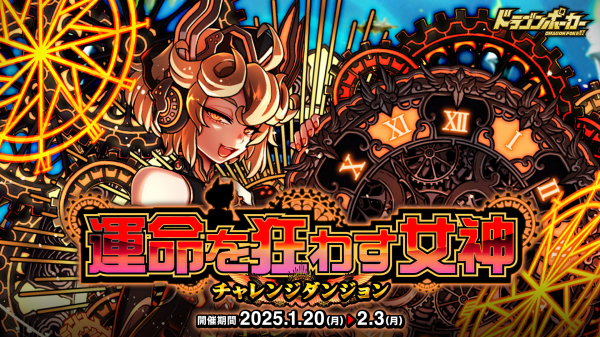 株式会社アソビズム(本社:東京都千代田区、代表取締役:大手智之)は、App Store・Google Playにて好評配信中のリアルタイム合体カードバトル『ドラゴンポーカー』で、2025年1月20日(月)より新チャレンジダンジョン「運命を狂わす女神」を開催いたします。