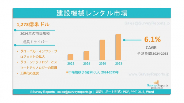 サーベイレポート合同会社は、建設機械レンタル市場の予測評価を提供する調査レポート「建設機械レンタル市場:機器タイプ別(土木機械、運搬機械、コンクリート・道路建設機械、その他);用途別(住宅用、商業用、産業用)-世界市場分析、動向、機会、予測、2024-2033年」を2025年1月に発行したと発表しました。建設機械レンタル市場の成長促進要因、市場機会、課題、脅威など、いくつかの主要な市場ダイナミクスを紹介しています。
