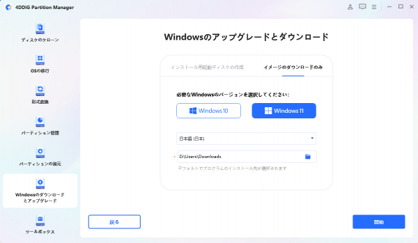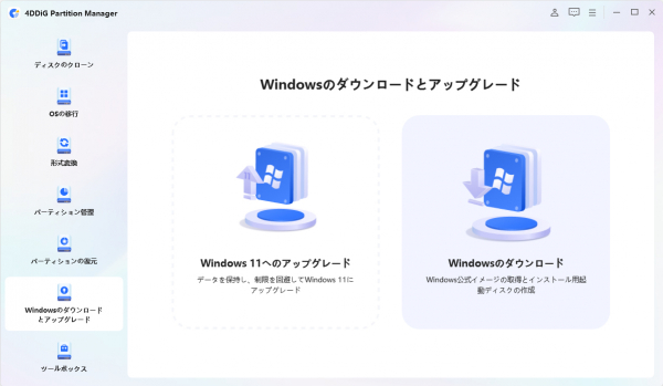 手順1.4DDiG Partition Manager を起動し、「Windowsのダウンロードとアップグレード」をクリックして、「Windowsのダウンロード」を選択します。