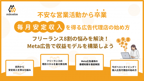 Meta広告を活用した具体的な運用方法や、実際に収益を得るまでのプロセスを解説。専門知識がゼロだった方でも、広告代理店として安定収入を得られるようになった実例もご紹介いたします。