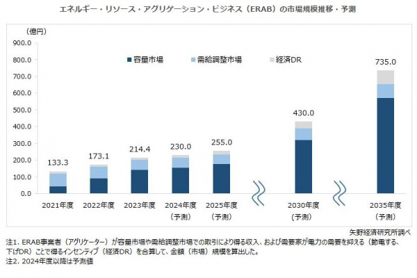 2025年度のエネルギー・リソース・アグリゲーション・ビジネス市場を255億円、2030年度は430億円、2035年度には735億円に拡大を予測する。