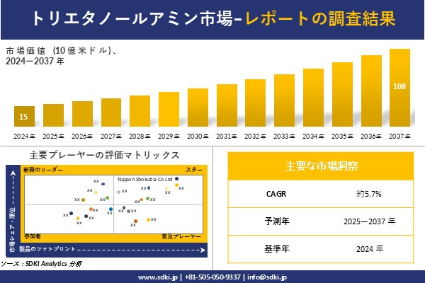 SDKI Analytics(本社:東京都渋谷区)は、このたび、2025年01月21に「トリエタノールアミン市場調査レポート:2025-2037年の市場規模、シェア、傾向の予測」を発表しました。トリエタノールアミンに関する市場調査レポートには、統計的および分析的アプローチを使用した予測評価が含まれています。この調査レポートでは、一次および二次調査方法を使用して分析された主要な業界洞察を通じて将来の傾向を理解できるようにすることで、主要な市場動向を読者に説明しています。