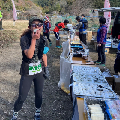 約600人がエントリーして、完走率は15kmで98.95%、8kmで98.53%と非常に高く、多くのランナーがフィニッシュすることができました。明日香野はエイドで、よもぎ、塩、豆の3種類のあんこ餅を振る舞いました。