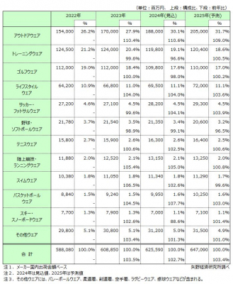2023年に新型コロナウイルスの感染症法上の位置づけが5類に移行し社会活動の正常化が進んだことで、2024年も競技シーンで着用するための需要が安定した。さらに、日常生活での着用を目的としたライフスタイルシーンでの需要や、応援するチームのレプリカユニフォームなどファンによる需要、訪日外国人客数増加に伴うインバウンド需要も好調で、前年からプラス成長を見込む。