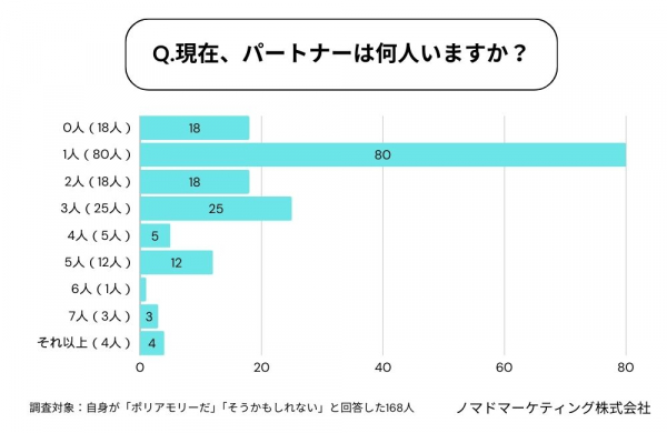 「ポリアモリーだ」「ポリアモリーかもしれない」と回答した168人に対し、現在パートナーが何人いるのかを聞きました。