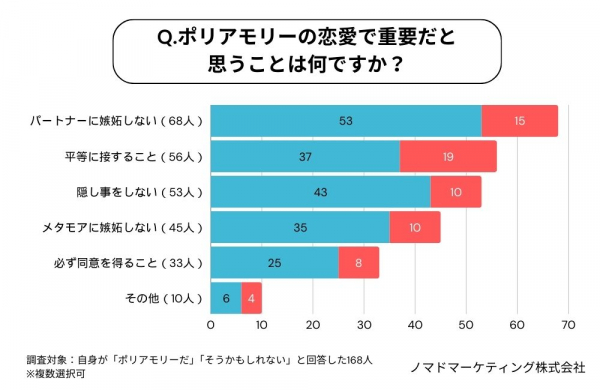 全体でもっとも多かったのは「パートナーに嫉妬しない(68人)」でした。次に「平等に接すること(56人)」「隠し事をしない(53人)」「メタモアに嫉妬しない(45人)」と続きます。