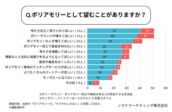 もっとも多かったのは、「ポリアモリーという考え方を受け入れてほしい(51人)」でした。同率で、「ポリーラウンジが増えてほしい(51人)」も続きます。