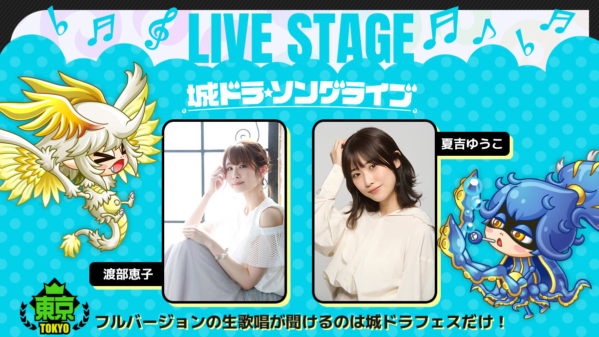 2月15日(土)に開催される「城ドラフェス2024-2025」では、人気声優の渡部恵子さん(ホワドラガール担当)、夏吉ゆうこさん(クラーケンガール担当)をお招きして、会場で「城ドラ☆ソングライブ」を行います!フルバージョンの生歌唱が聞ける貴重な機会を、お見逃しなく!