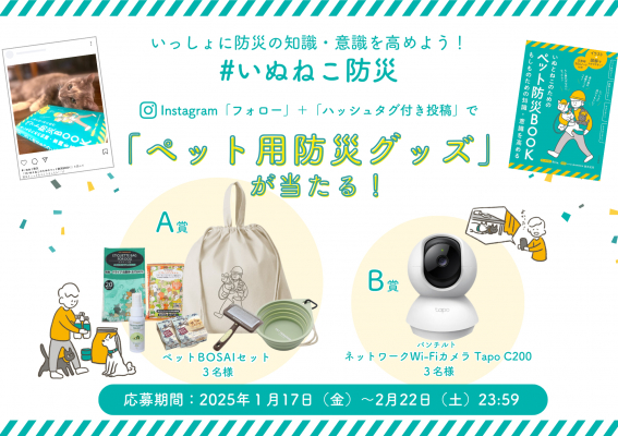株式会社三笠書房(東京都千代田区/代表取締役:押鐘太陽)は、新刊書籍『いぬとねこのためのペット防災BOOK』(作・イラスト:Rina./監修:鈴木正芳〈さかまち動物病院院長〉)の発売にあたって、2025年1月17日(金)より、「いっしょに防災の知識・意識を高めよう!」をテーマに、ペット用防災グッズが当たるプレゼントキャンペーンを実施いたします。