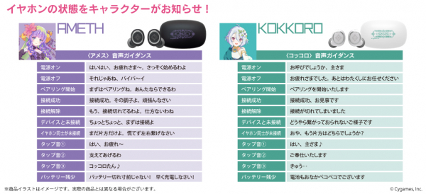 本コラボレーションモデルは、「アメス」と「コッコロ」との2モデル。左右ハウジングに各モチーフをレーザー加工、充電ケース天面にキャラ名や作品タイトル入りのモチーフを印刷加工し、各キャラクターの世界観を表現したオリジナルデザインとなっております。ハウジングは起動時にLED点灯。搭載音声ガイダンスは「アメス」と「コッコロ」それぞれの新規録り下ろしボイス。電源オンやオフ、ペアリング時やタップ音等の計11ワードのボイスを搭載しております。