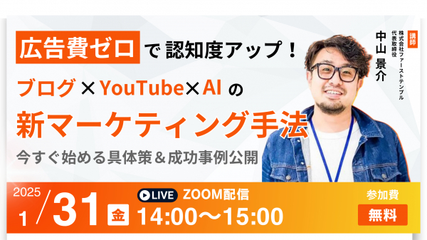 本セミナーでは、「ブログ×YouTube×AI」を組み合わせた全く新しい手法を紹介し、実践的なノウハウや成功事例をお伝えします。SEOやコンテンツマーケティングの基礎から、AIを活用した効率化テクニック、そして低コストで成果を最大化する方法を学ぶことで、参加者が即実行可能なスキルを習得できる内容です。