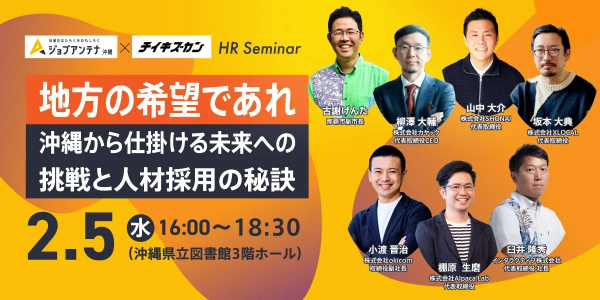 地域に特化した双方向な求人マッチングサービス「ジョブアンテナ」を運営しているインタラクティブ株式会社(本社:沖縄県宜野湾市、代表取締役社長:臼井 隆秀、以下「インタラクティブ」)は、都市と地方の人材流入を逆転する地方特化型のリクルートサービス「チイキズカン」を提供している株式会社XLOCAL(本社:山形県鶴岡市北京田字下鳥ノ巣23-1、代表取締役:山中 大介・坂本 大典、以下「XLOCAL」)と共催で、2025年2月5日(水)に沖縄にてHRセミナー「地方の希望であれ。~沖縄から仕掛ける未来への挑戦と人材採用の秘訣~」を開催します。