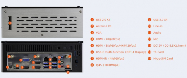 8. 豊富なインターフェースUSB-C、VGA、HDMI IN、HDMI 4K、HDMI 8K、USB3.0 x 4、RJ45 x 2、Line-IN、Phone、Mic、TFカード、SIMカード、DC 12Vなど、さまざまなインターフェースを備えています。