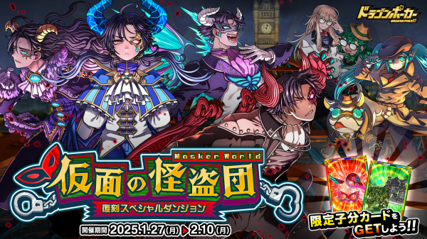株式会社アソビズム(本社:東京都千代田区、代表取締役:大手智之)は、App Store・Google Playにて好評配信中のリアルタイム合体カードバトル『ドラゴンポーカー』で、2025年1月27日(月)より復刻スペシャルダンジョン「仮面の怪盗団 Masker World」を開催いたします。