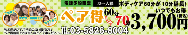 【上野御徒町店】ペア得キャンペーン! お一人様あたり70分 3,700円(税込)