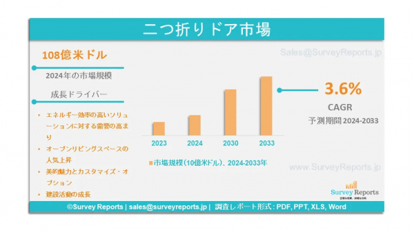サーベイレポート合同会社は、2025年1月に調査レポート「二つ折りドア市場はタイプ別(フレンチドア、スライド式ポケットドア)、材料別(木製、金属製、ガラス製、ビニール製、ガラス繊維製、その他の材料)、用途別(室内ドア、室外ドア)、エンドユーザー別(住宅、非住宅)に区分される - 二つ折りドア市場の予測評価を提供する世界市場分析、動向、機会、予測、2024-2033年」を出版したと発表しました。この調査レポートは、二つ折りドア市場の予測評価を提供し、二つ折りドア市場の成長促進要因、市場機会、課題、脅威など、いくつかの主要な市場ダイナミクスを明らかにします。