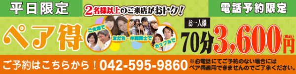 【立川店】ペア得キャンペーン お一人様あたり70分 3,600円(税込)