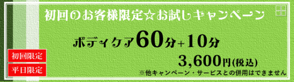 初回のお客様限定☆お試しキャンペーンは、初めて来店されたお客様がお得にボディケアを受けられるキャンペーンです。