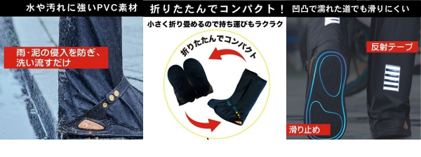 水や汚れに強いPVC素材のため、雨や雪、泥汚れからも靴や足元をガードします。