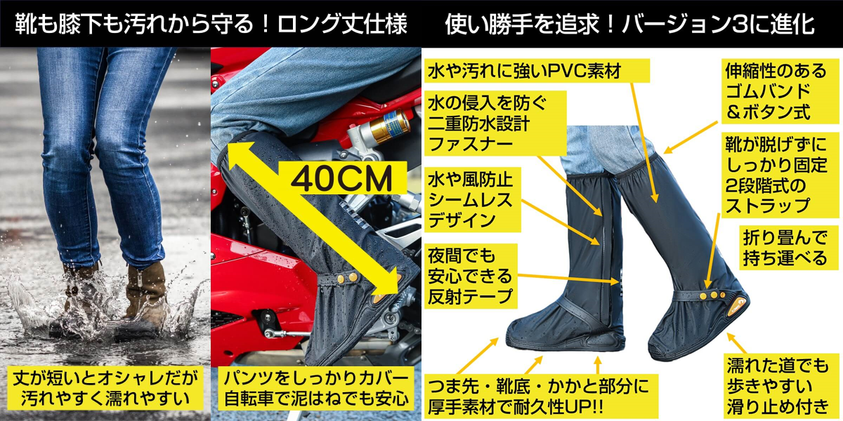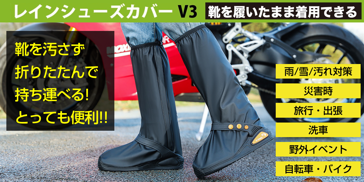 「レインシューズカバーV3」は、突然の雨や雪、泥などから靴や洋服をしっかりと守る画期的なロングカバーです。新しいデザインと強化された素材で、防水性と耐久性が大幅に向上しました。折りたたんで持ち運びが可能で、旅行や出張時にも大変便利です。雨・雪・泥地での防護、自転車・バイク走行時、車やバイクの洗車時、お風呂掃除、旅行や出張、アウトドア、釣りや潮干狩りなどの水遊び、ガーデニング、防寒対策、災害時の利用、擦り傷防止対策など。お客様の声を反映して開発された「レインシューズカバーV3」は、様々なシーンであなたの足元を守ります。ぜひご利用ください。