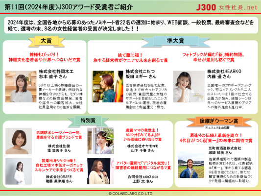 国内最大級の女性経営者データベースサイトを運営する女性社長. net((株)コラボラボ企画・運営 本社:東京都千代田区 代表取締役:横田響子)は、全国の個性あふれる女性起業家・経営者を表彰する「J300アワード」の受賞者8名を、2025年1月29日に発表しました。