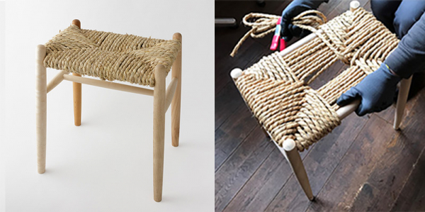座面に、藁縄(わらなわ)を編み込んでスツールを完成させます。脚の部分は、組み立て・オイル仕上げ済みのものを用意しておりますので、長く安全にお使いいただけます。