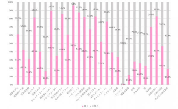 調査結果から、育児関連商材で購入率が最も高いのは紙おむつや離乳食レトルト、ベビーソープなどの日用品であり、次いで抱っこひもやチャイルドシートなどの大物アイテム、出産内祝いや写真館などイベント関連が目立つ結果となった。各商材の購入主導は日用品がママ、住宅や自動車、家電などがパパ、節句関連が祖父母などと商材ごとにすみ分けがされている傾向があることもわかった。