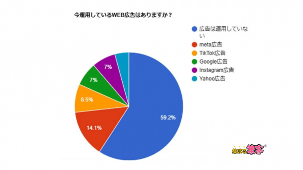 回答者の約60%は広告運用をしていない。広告で一番多いのはmeta広告。