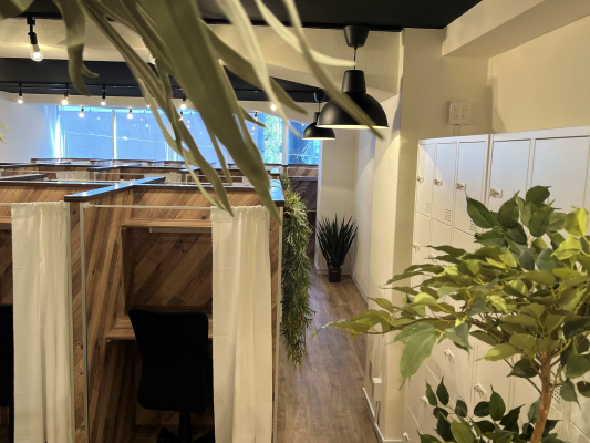 アイデスク自習室の特徴:半個室スペースは、パーテーションが高く、背面にはカーテンを採用し利用者の方々のプライバシーを保護できる環境を整えております。