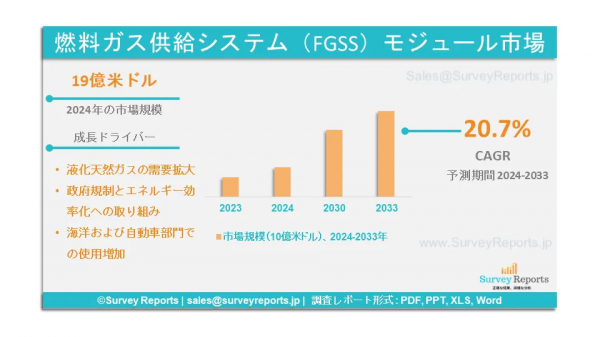 サーベイレポート合同会社は、燃料ガス供給システム(FGSS)モジュール市場の予測評価を提供する2025年2月発行の調査レポート「燃料ガス供給システム(FGSS)モジュール市場のタイプ別(低圧、高圧);用途別(貨物船、クルーズ船、その他)セグメント - 世界市場分析、動向、機会、予測、2024-2033年」を発表しました。燃料ガス供給システム(FGSS)モジュール市場の成長促進要因、市場機会、課題、脅威など、いくつかの主要な市場ダイナミクスを紹介しています。