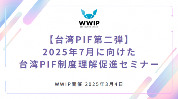 株式会社ワールドワイド・アイピー・コンサルティングジャパン (以下「WWIP」 : 東京都文京区) は、2025年3月4日(火)13:30~15:30に、「【台湾PIF第二弾】2025年7月に向けた台湾PIF制度理解促進セミナー」を開催いたします。