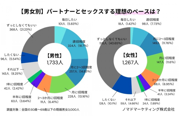男女別で見ると、男性は1,733人中931人(53.72%)、女性は1,267人中906人(71.51%)が満足していると回答しており、半数以上がセックスの頻度について不満を持っていないことがわかります。