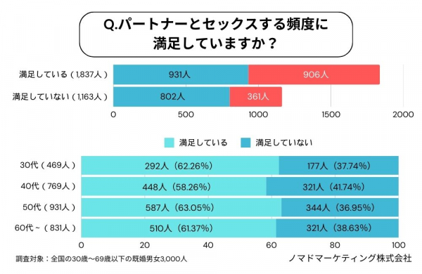 既婚者向けマッチングアプリ「既婚者クラブ」のユーザーを中心に、ノマドマーケティング株式会社(東京都渋谷区)が全国の30歳~69歳までの既婚男女3,000人を対象に、「セックスレスに関するアンケート調査」を実施しました。
