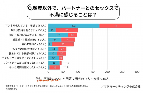セックスの不満については、夫婦でよくある「マンネリ化」が最多。しかし、「あまり気持ち良くない」「潤い・勃起の悩みがある」など、相手に言いにくい項目を選んだ人も多く見られました。