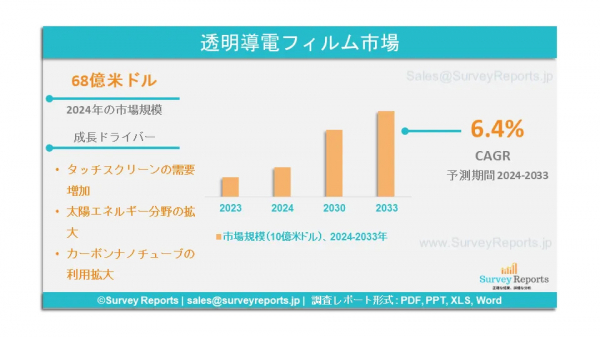サーベイレポート合同会社は、市場調査レポート「透明導電性フィルム市場 アプリケーション別(スマートフォン、タブレット、ノートパソコン、LCD、ウェアラブルデバイス、その他)、材料別(ガラス上の酸化インジウムスズ、PET上の酸化インジウムスズ、銀ナノワイヤー、金属メッシュ、カーボンナノチューブ、その他) - 透明導電性フィルムの世界市場分析、動向、機会、予測、2024-2033年」を2025年2月に発表しました; この調査レポートは、透明導電性フィルム市場の予測評価を提供する、用途別(水処理、食品・飲料、環境モニタリング、化粧品、その他)の世界市場分析、動向、機会、予測、2024-2033年です。透明導電性フィルム市場の成長促進要因、市場機会、課題、脅威など、いくつかの主要な市場ダイナミクスを紹介しています。